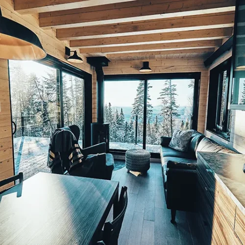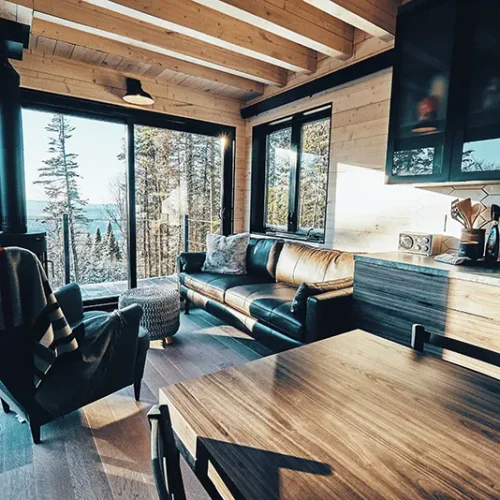 Le MIR est un micro-chalet juché sur 2 étages pouvant accueillir jusqu’à 4 personnes. Bâti sur un lot de 450 000pi2, il est l’endroit parfait pour se ressourcer. Vous pourrez y admirer de par son orientation ouest des couchers de soleil mémorables. Durant votre séjour, optez pour la formule bike-in/bike-out, à moins de deux minutes du chalet vous y trouverez une trail du secteur Maelström des Sentiers du Moulin. Un grand atout pour tous les sportifs qui n’auront qu’à s’habiller pour aller pratiquer leur sport favori (raquette, fat bike, bike).