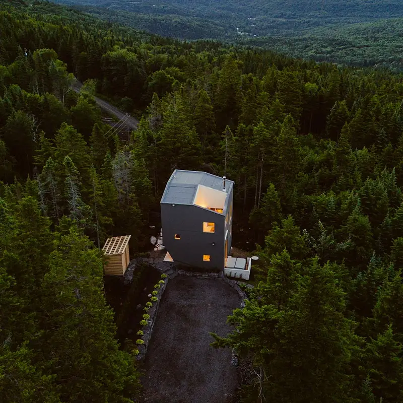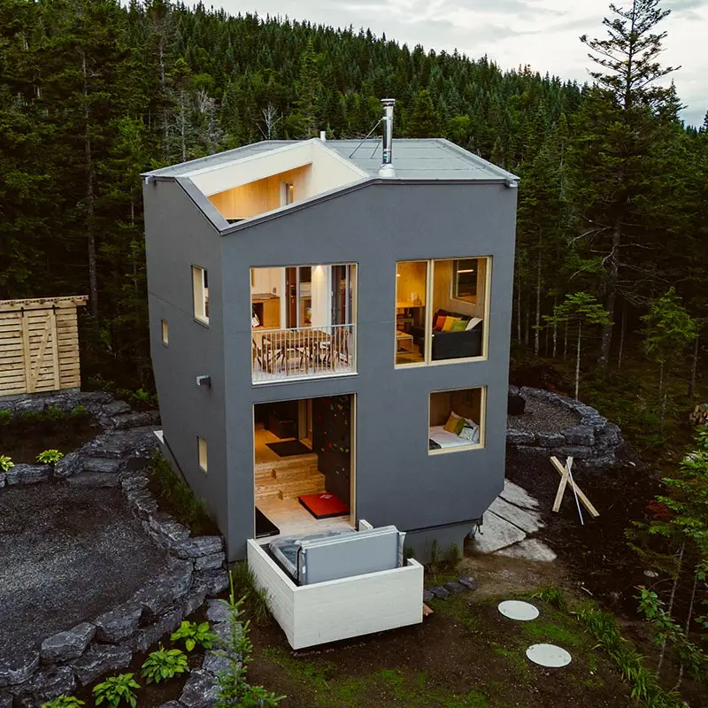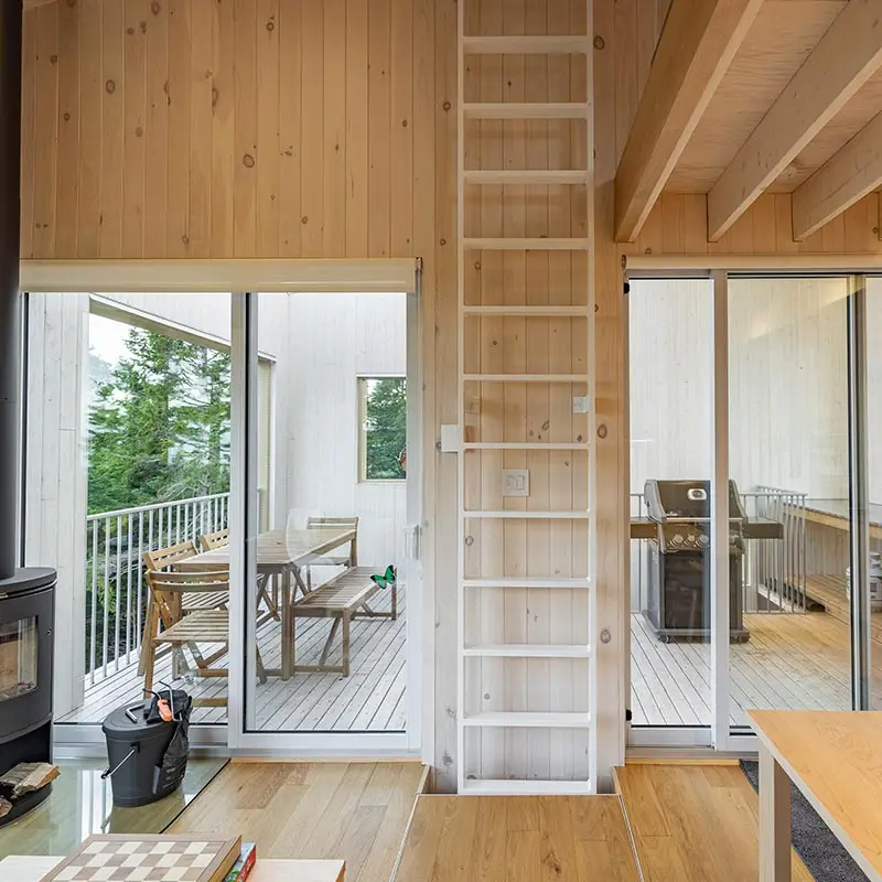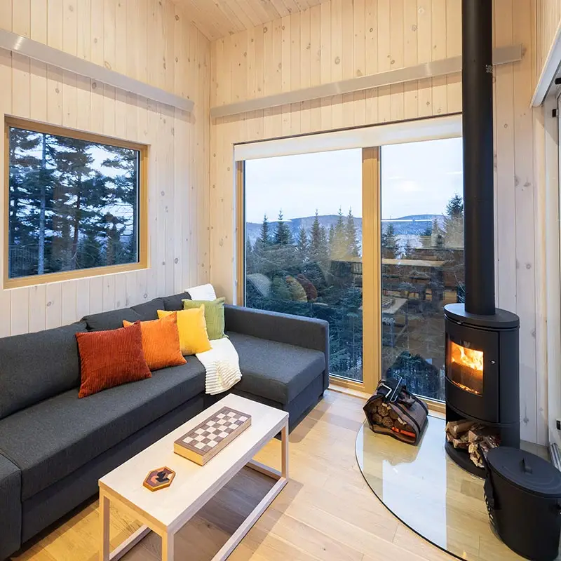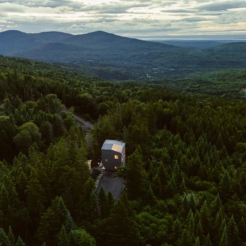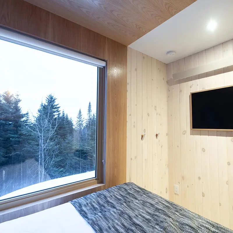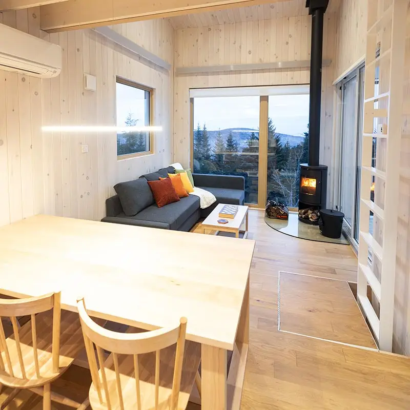 The cabin BLOK, a jewel of architecture perched almost at the top of Maelström Mountain with mountain with block climbing wall with routes, covered. The BLOK promises a stay experience where design and nature coexist in perfect harmony. With a capacity for 9 people, Blok is an invitation to relaxation for groups and families. It not only offers comfortable rooms and a charming mezzanine but also breathtaking views thanks to its large windows that capture the sunset over the mountains.