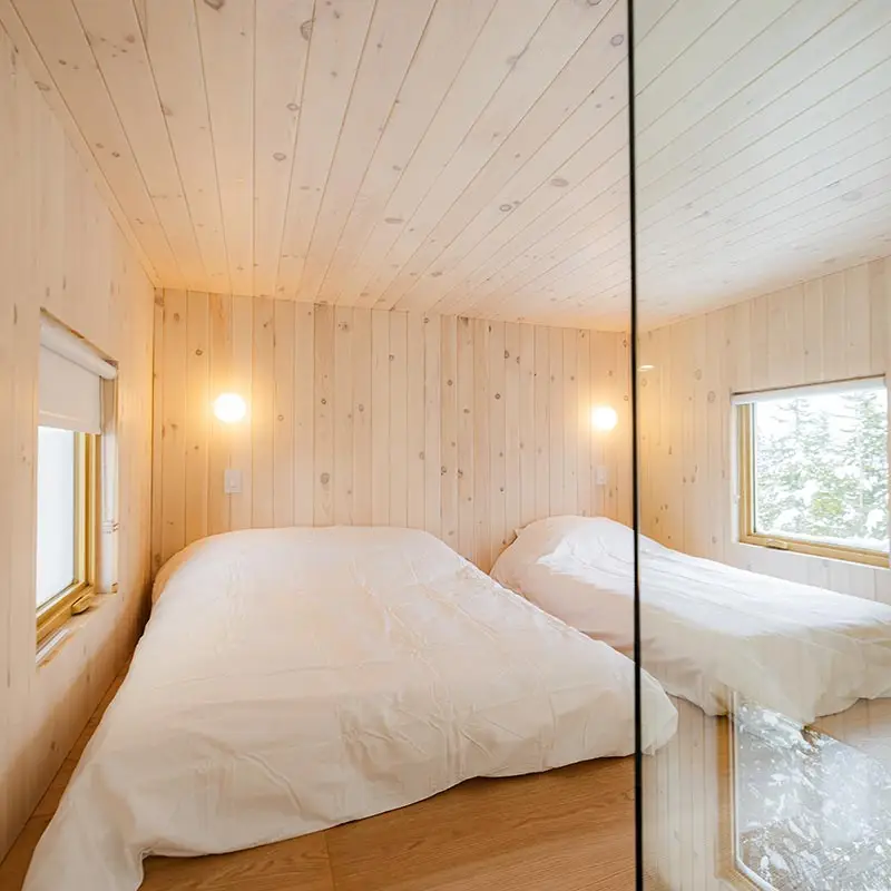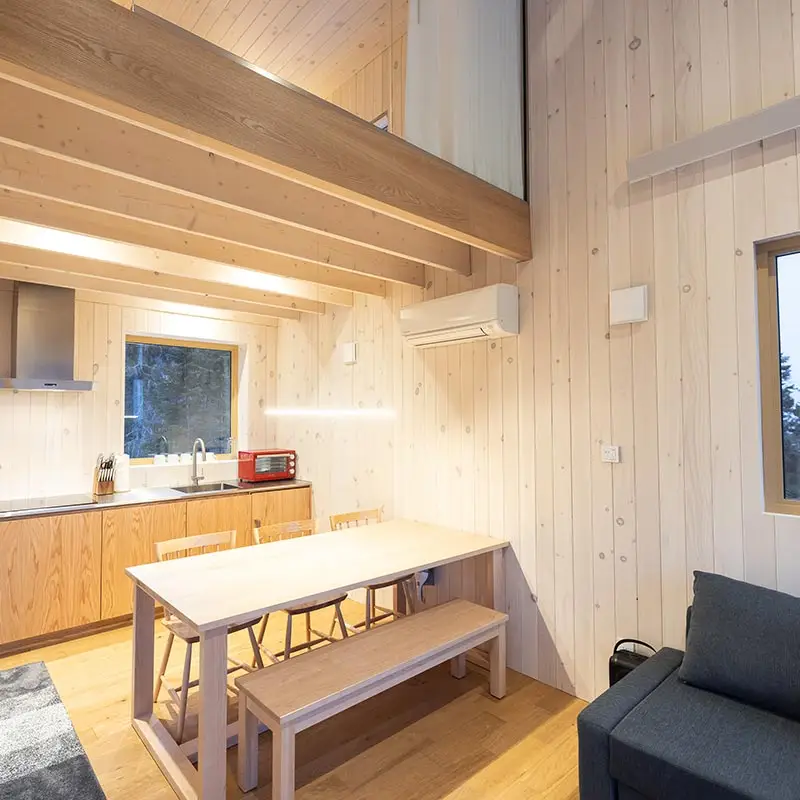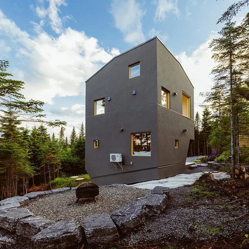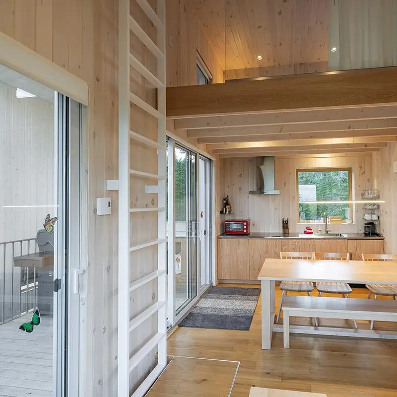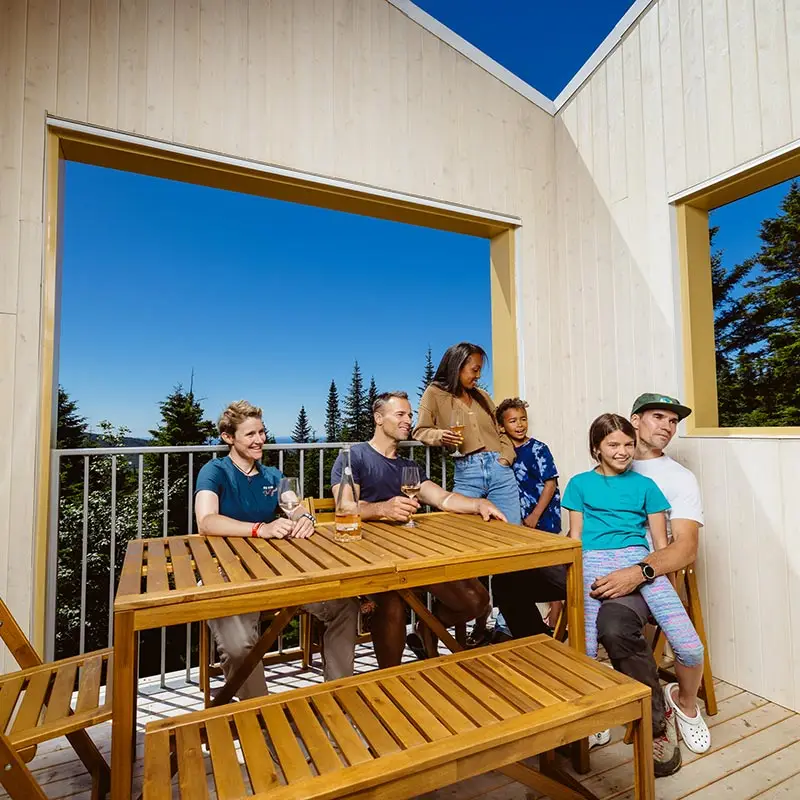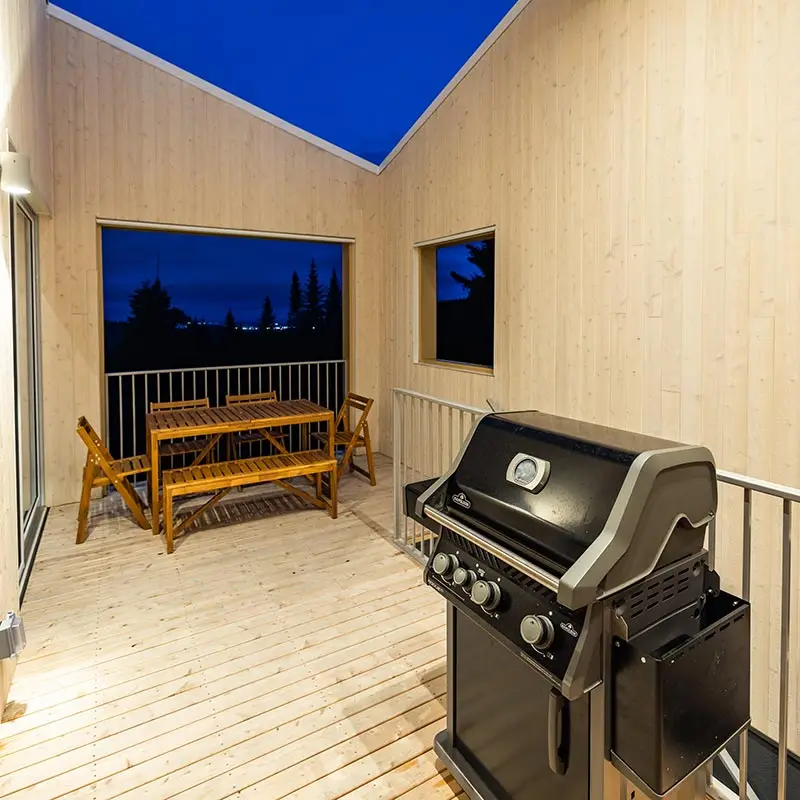 The cabin BLOK, a jewel of architecture perched almost at the top of Maelström Mountain with mountain with block climbing wall with routes, covered. The BLOK promises a stay experience where design and nature coexist in perfect harmony. With a capacity for 9 people, Blok is an invitation to relaxation for groups and families. It not only offers comfortable rooms and a charming mezzanine but also breathtaking views thanks to its large windows that capture the sunset over the mountains.
