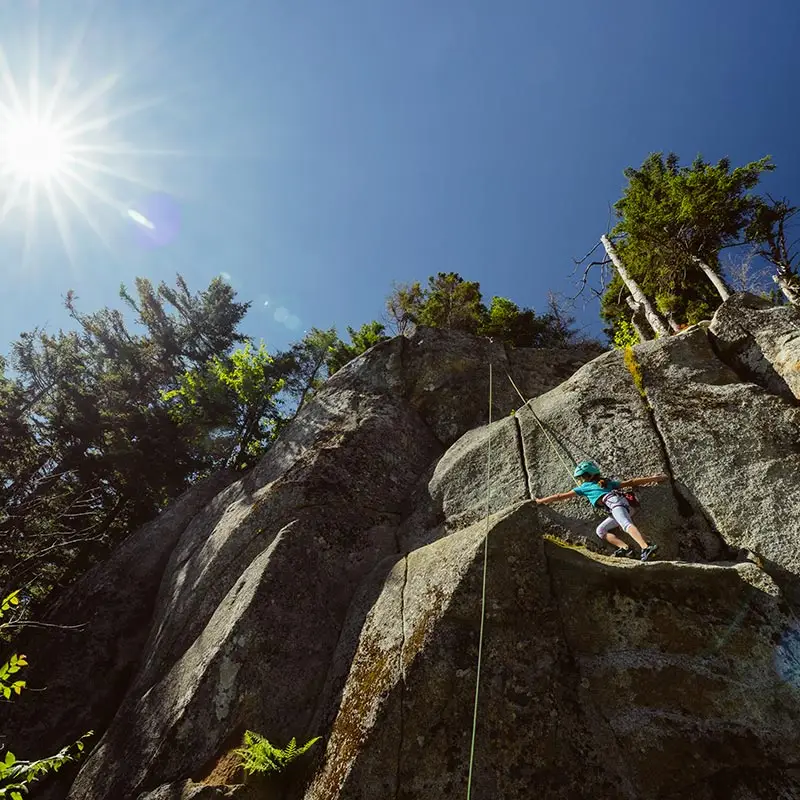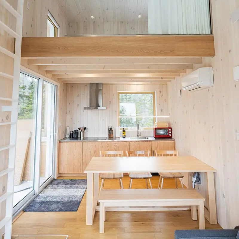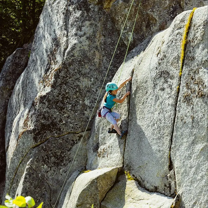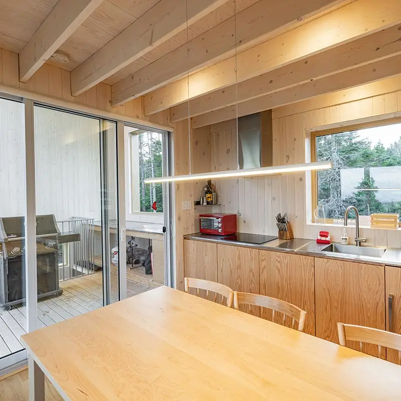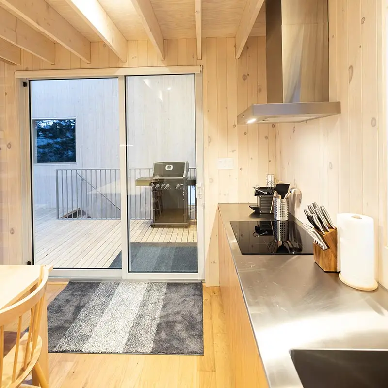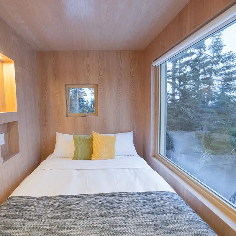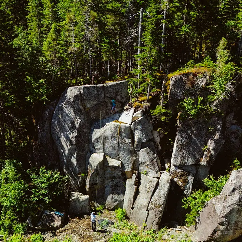The cabin BLOK, a jewel of architecture perched almost at the top of Maelström Mountain with mountain with block climbing wall with routes, covered. The BLOK promises a stay experience where design and nature coexist in perfect harmony. With a capacity for 9 people, Blok is an invitation to relaxation for groups and families. It not only offers comfortable rooms and a charming mezzanine but also breathtaking views thanks to its large windows that capture the sunset over the mountains.