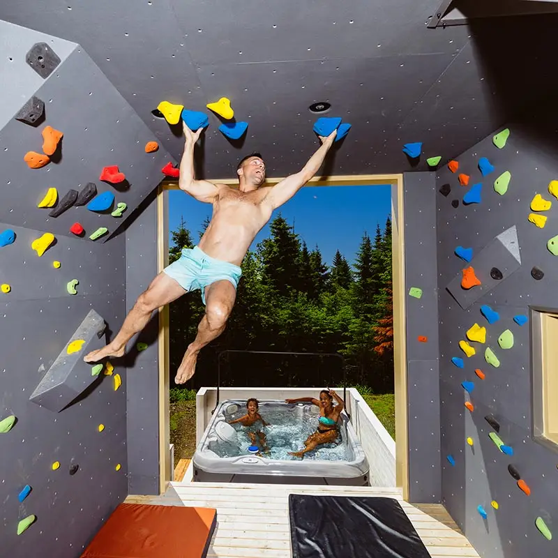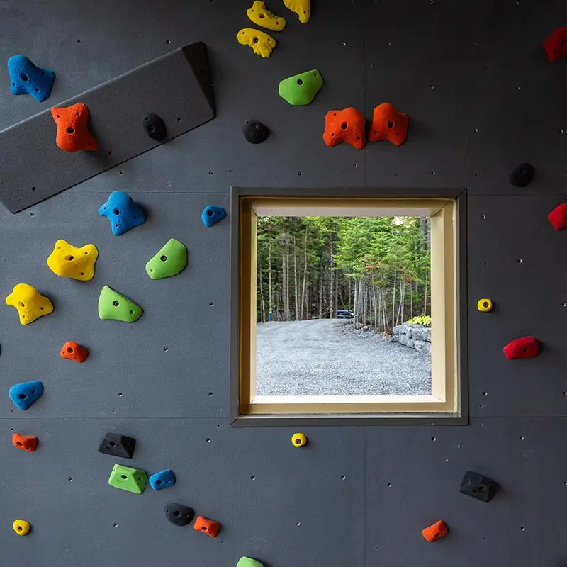 - Block climbing wall with routes, covered