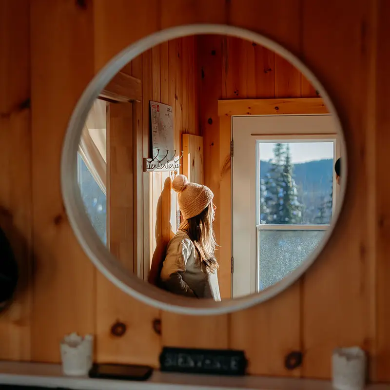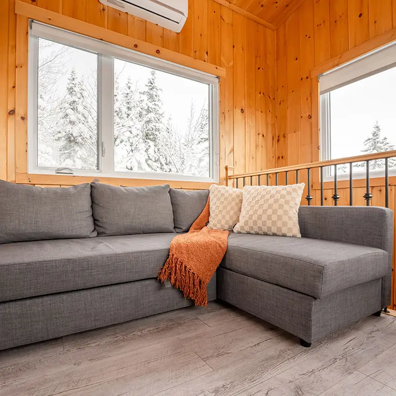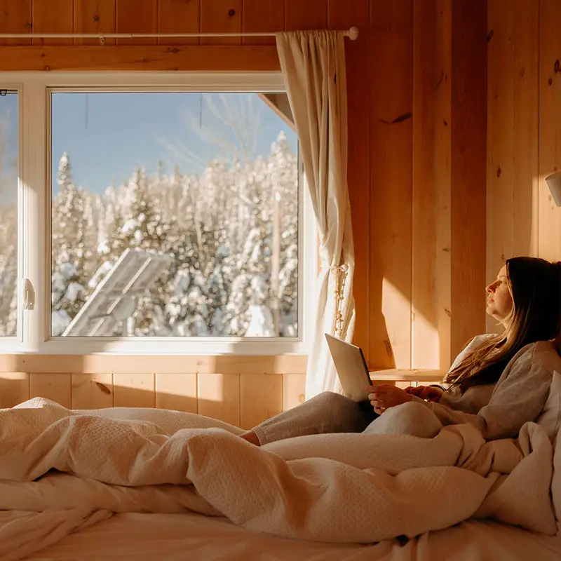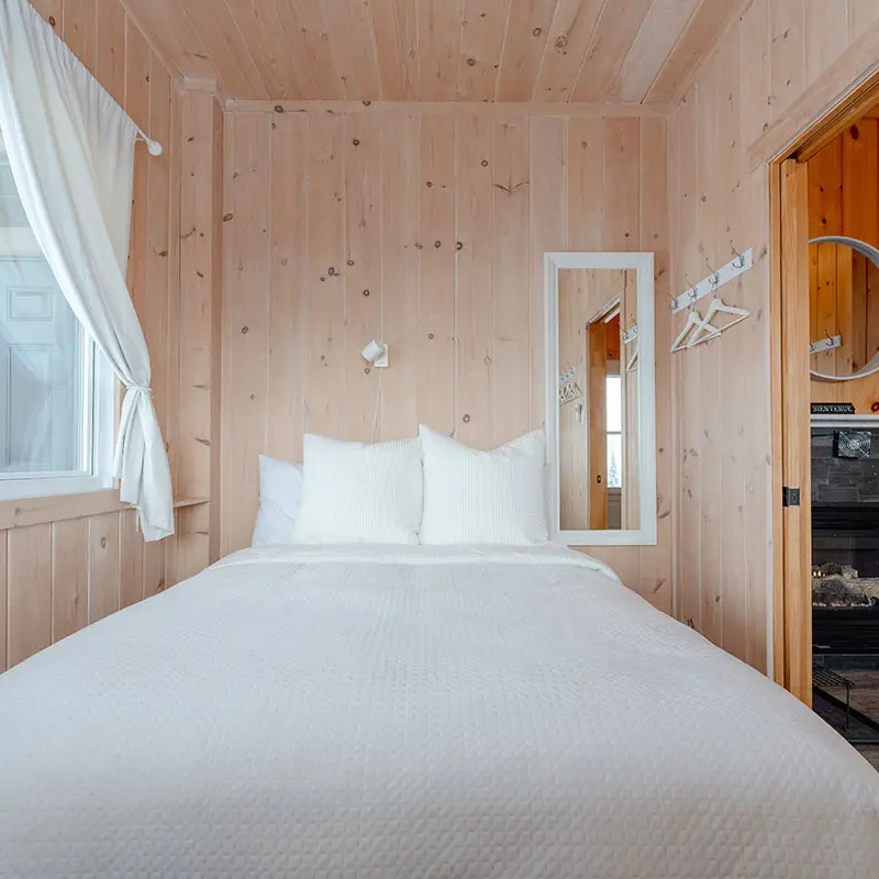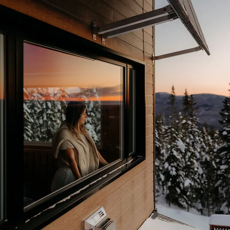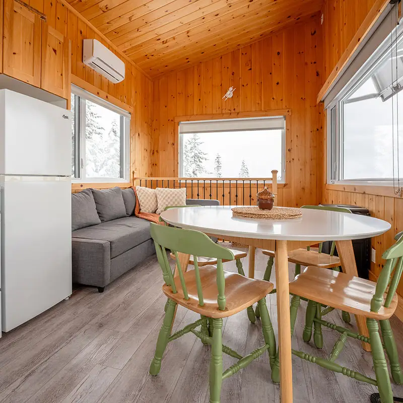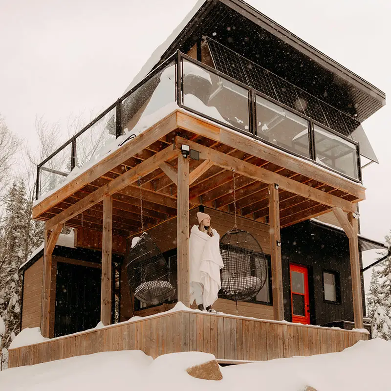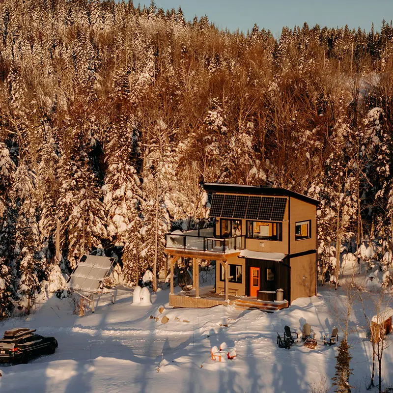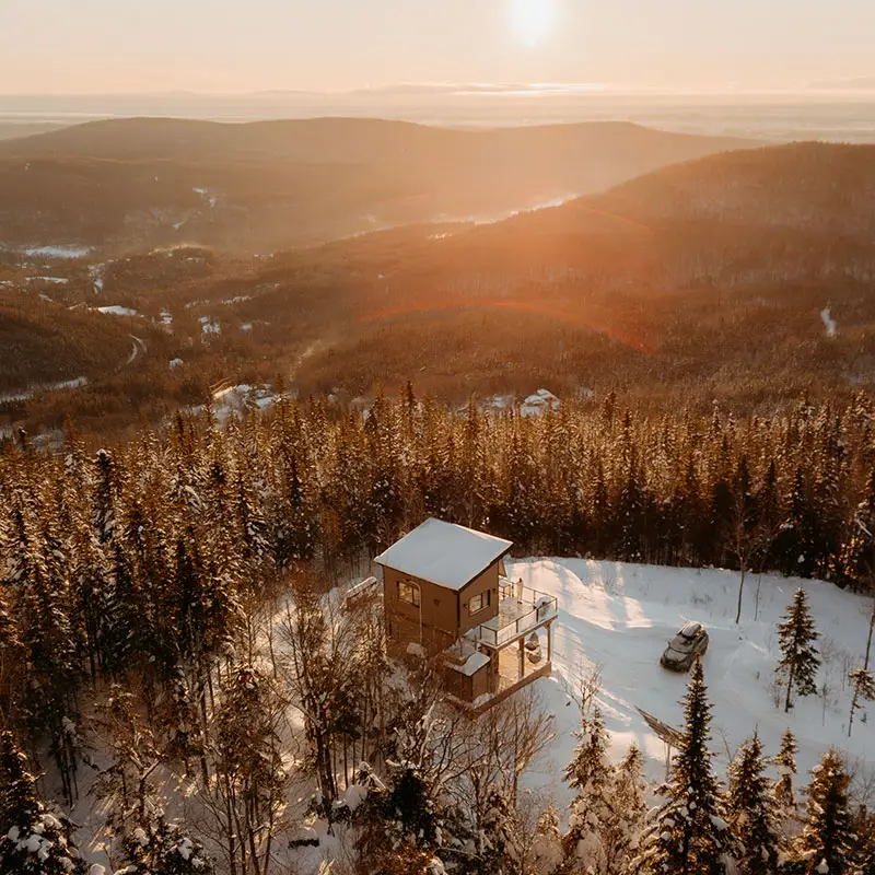 Helios is a two-story micro-chalet that can accommodate up to 4 guests. Be captivated by the panoramic mountain views and the tranquility of the setting. The chalet is 100% self-sufficient and powered by solar energy. Nestled in a vast and stunning playground, it offers direct access to hiking, mountain biking, and fat biking trails at Sentiers du Moulin, with the main entrance less than 5 minutes away (trails accessible directly from the chalet).