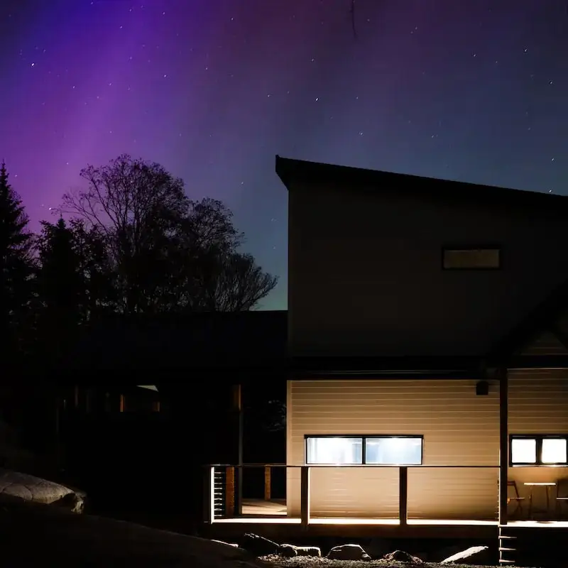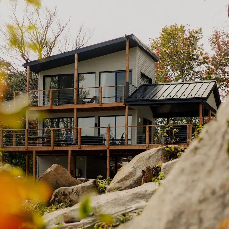 The spacious terrace is perfectly equipped, offering a panoramic view of the Saint Lawrence River in the background. Inside, the cabin is bright thanks to its large windows, allowing you to enjoy the beauty of the surrounding nature while benefiting from modern and cozy comfort.