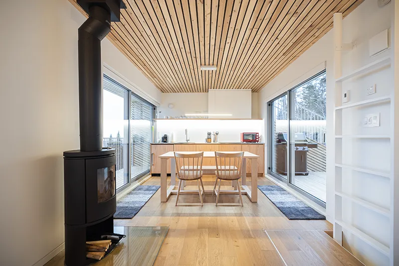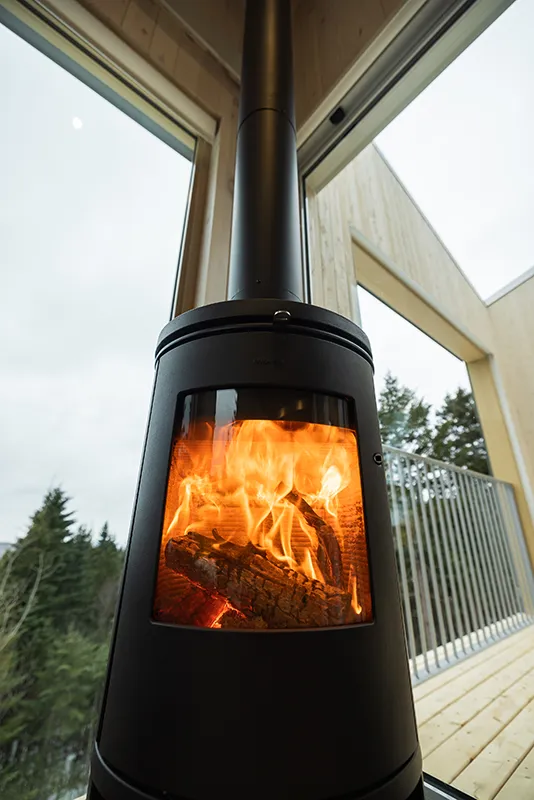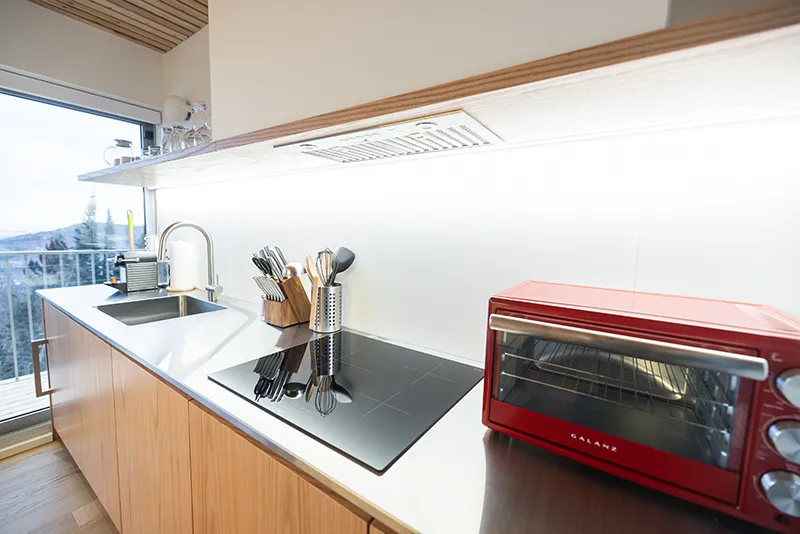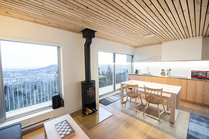 The large windows of the PEACE frame the splendor of the forest and mountains, offering breathtaking views and a sense of immersion in nature. Whether for cooling off or warming up, the chalet is equipped with air conditioning and a wood stove to cater to all desires. Gather around a spacious table for memorable meals. The kitchen, complete with all modern amenities, including a compact refrigerator, a small electric oven, and a coffee machine, will make your stay as convenient as it is enjoyable.